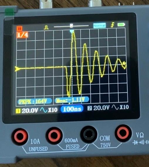 The correct mathematical way to compute charge would be to compute the integral of the current over time, but that’s not really fun, and probably not necessary. The amplitude of the voltage is about 80V and the duration of the pulse is about 700ns. Now imagine a triangle with the tips at the middle of the screen (0V,0ns position), the top center of the screen (80V,0ns) position and the right center of the screen (0V, 600ns position). If you mirrored all the negative current back up to the positive side of the graph, most of that triangle will be filled up by the current waveform. Therefore, we can use the area of the triangle as an approximation of the integral of the current, and therefore the charge delivered by the stun gun. The area of the triangle would be the amplitude (80V) times the duration (700ns) divided by 2. Convert the volts to Amps by dividing the voltage by the shunt resistance. Assuming a 1mOhm shunt, that would be 80,000V. The estimated charge would then be 80,000*0.0000007/2=0.028Coulombs, or 28mC.